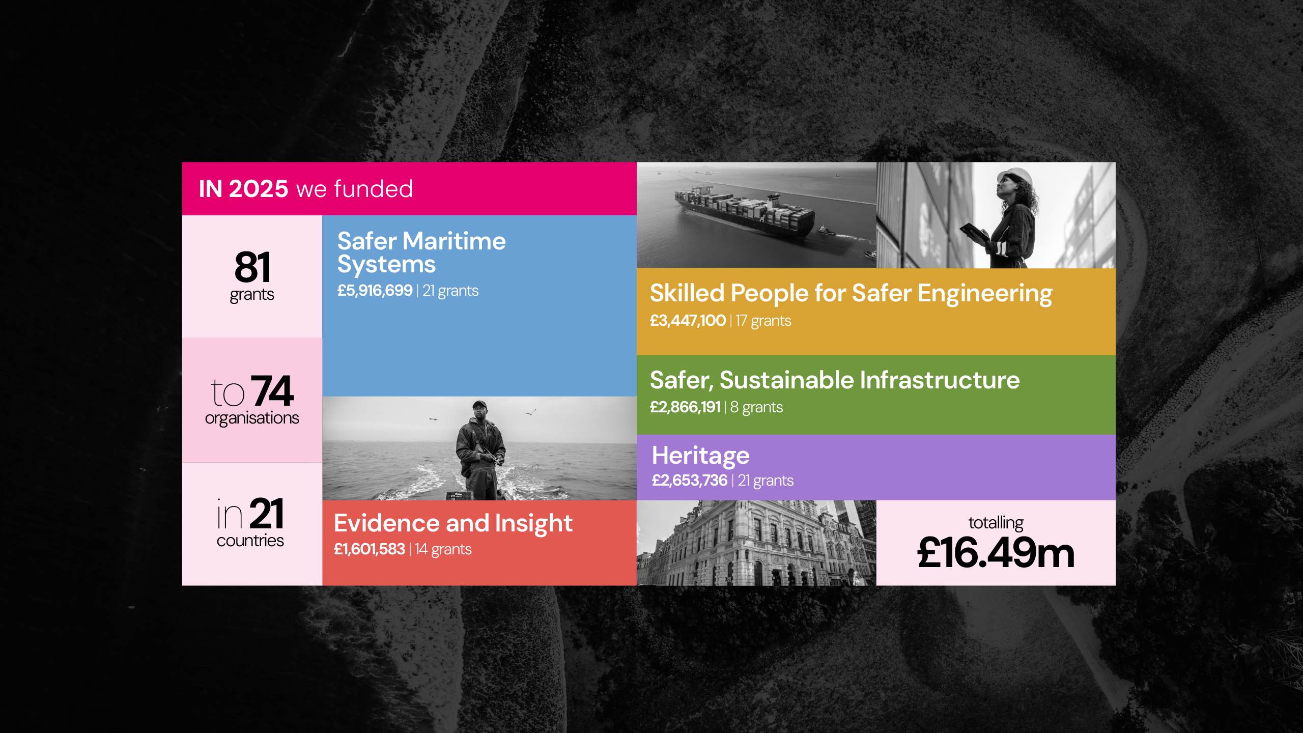 In 2025 we funded 81 new projects across 21 countries, totalling more than £16 million. These initiatives reflect our strategic priorities of Safer Maritime Systems, Skilled People for Safer Engineering, and Safer, Sustainable Infrastructure, as well as supporting our commitment to learning from the past and taking an evidence-led approach to our work.
